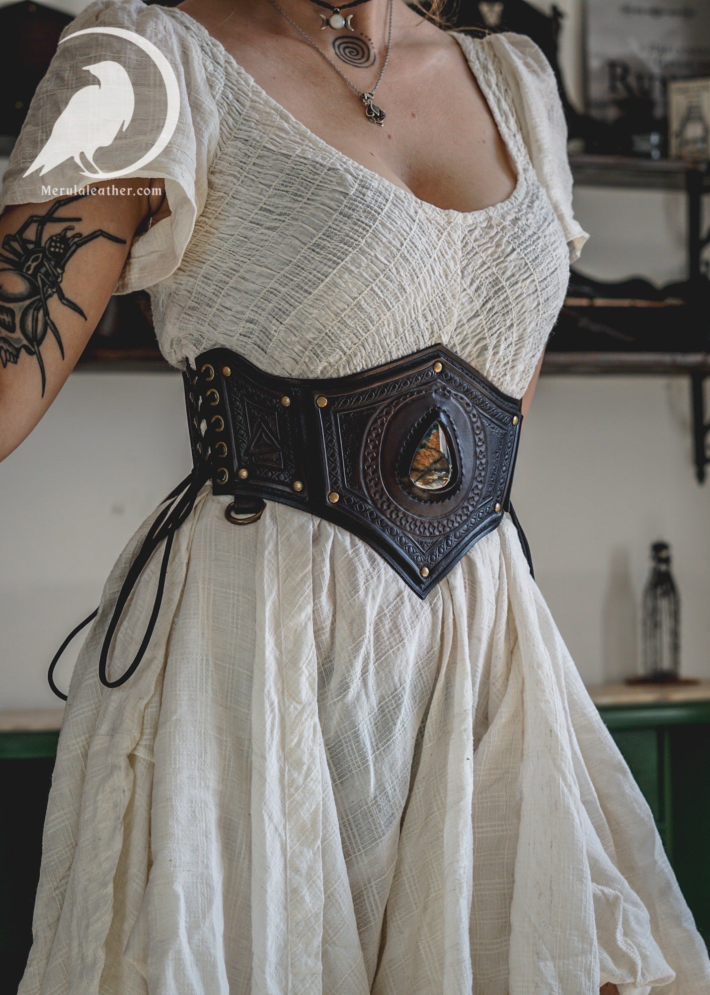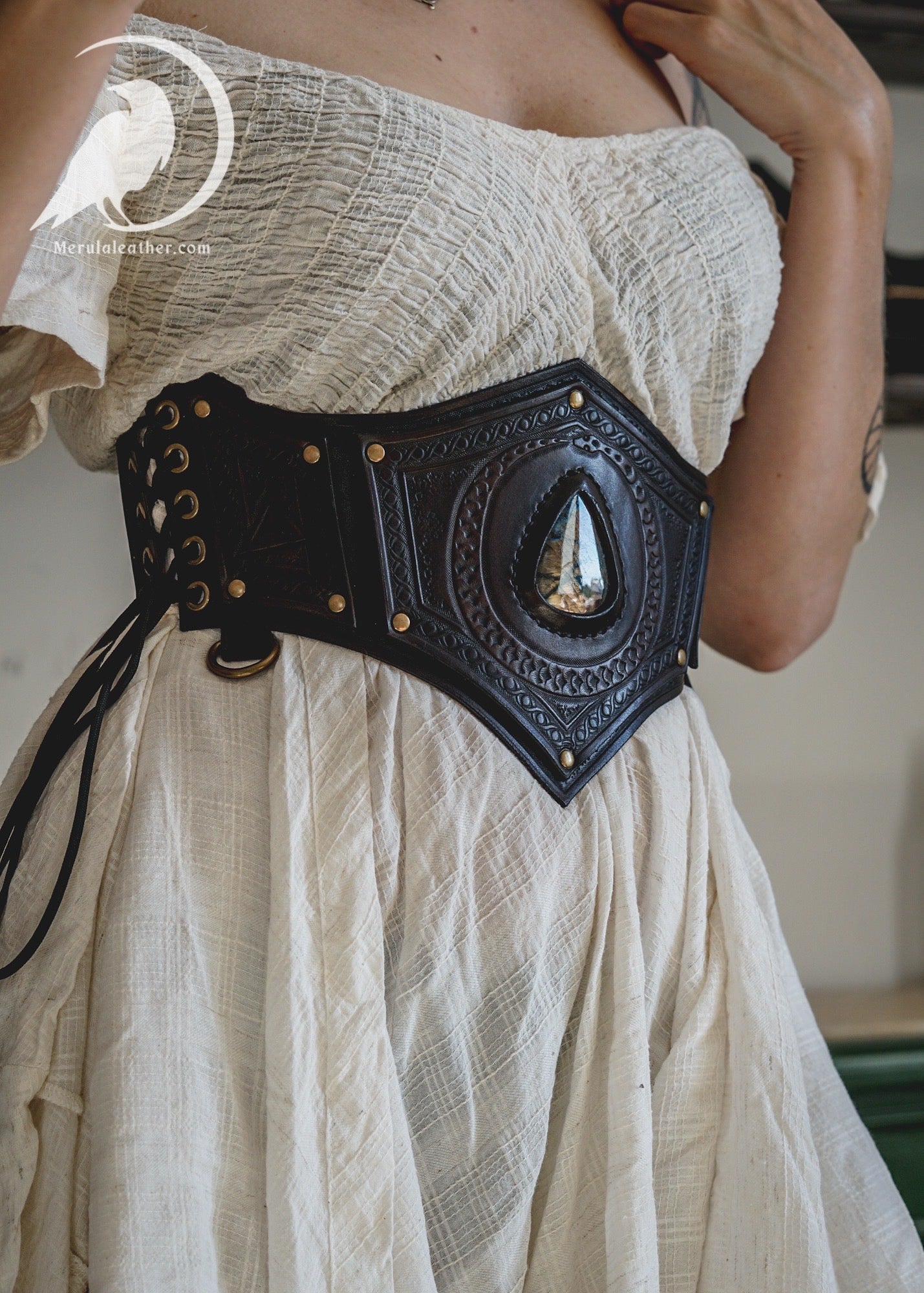 A sorcery inspired leather corset belt. The stone is a beautiful labradorite, often said to have magical properties.