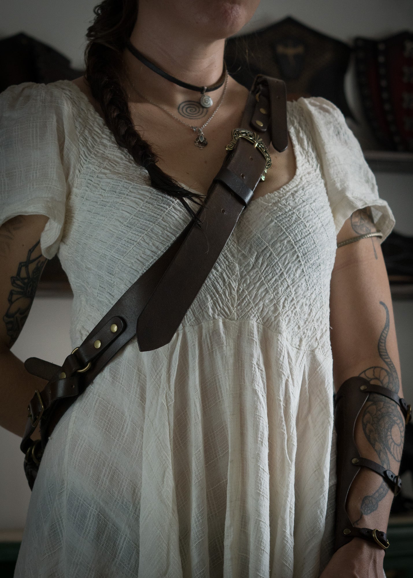 This arm guard has a dragon scale pattern sewn in the middle. Perfect for renfaires or traditional archery styles.