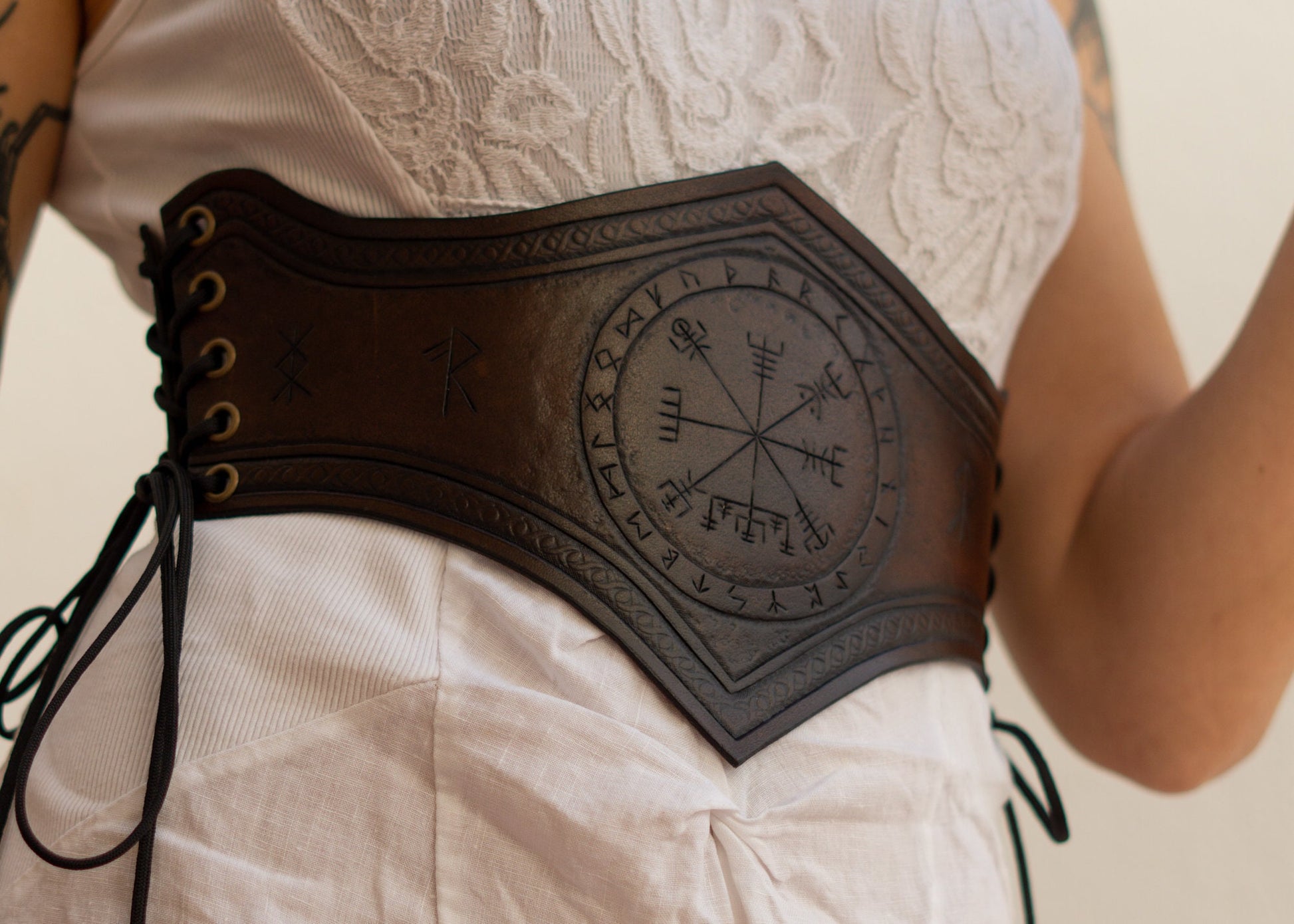 This belt features an Vegvísir. You could see this symbol as a compass, they say that when you carrie this symbol, you will not get lost.