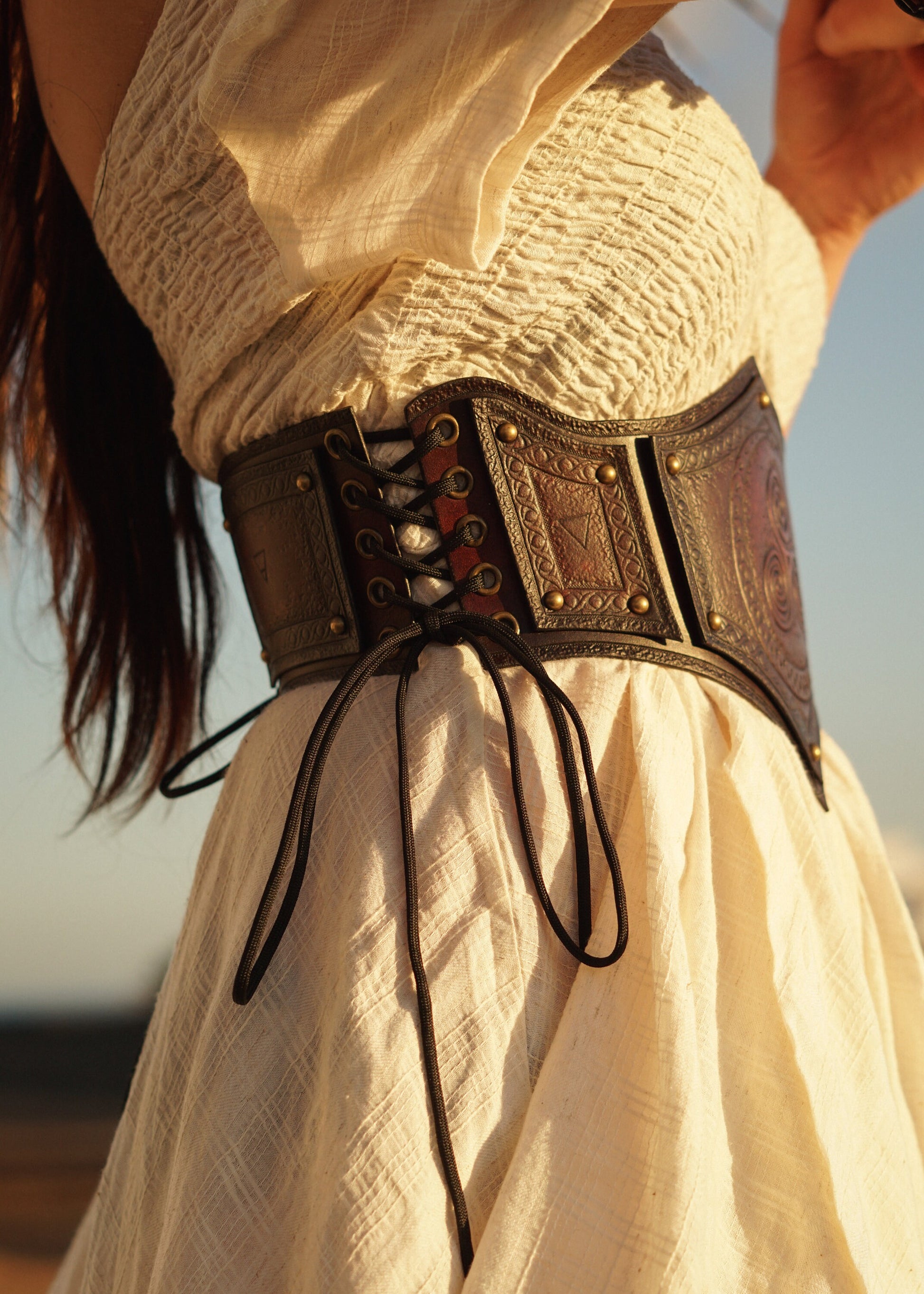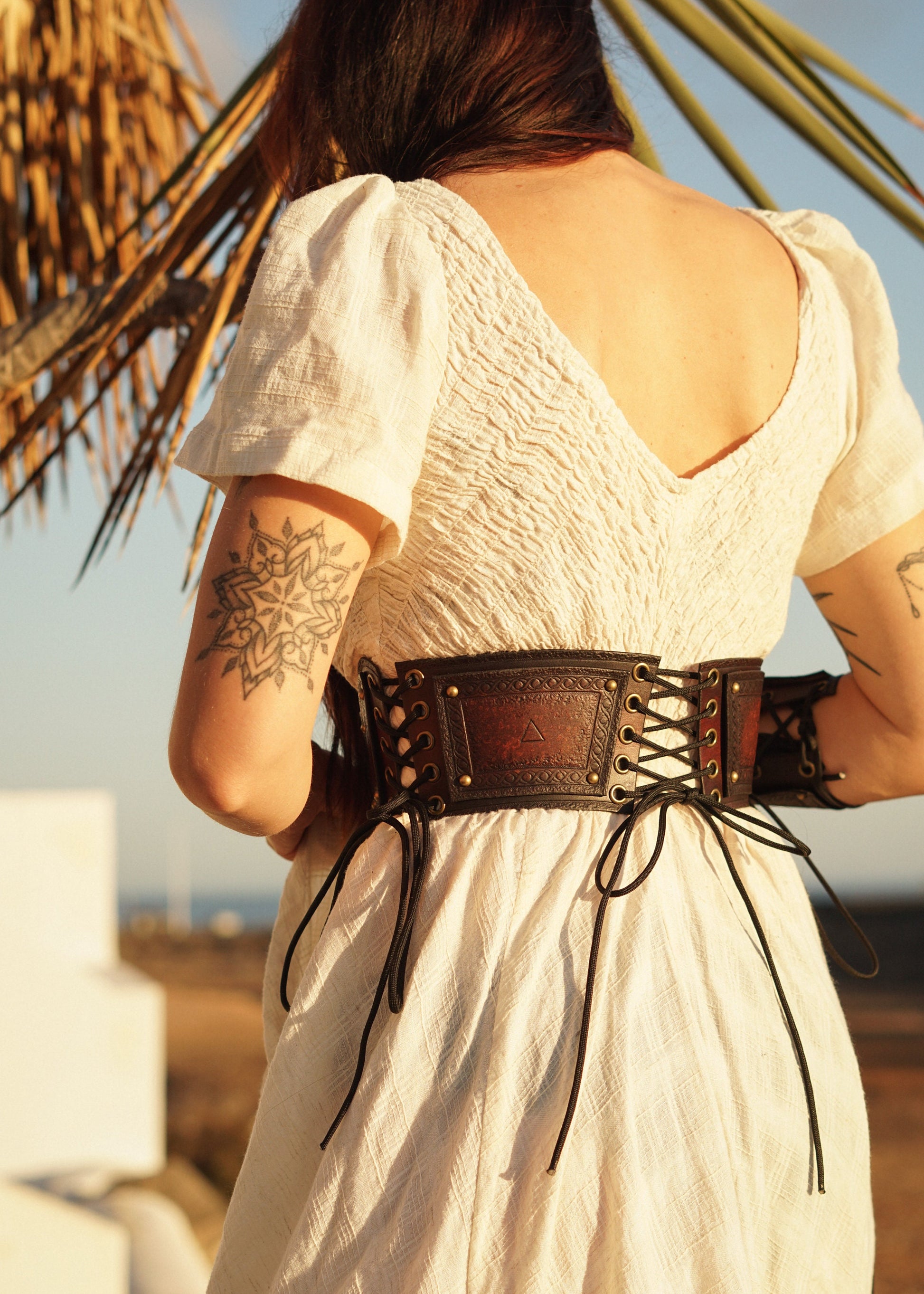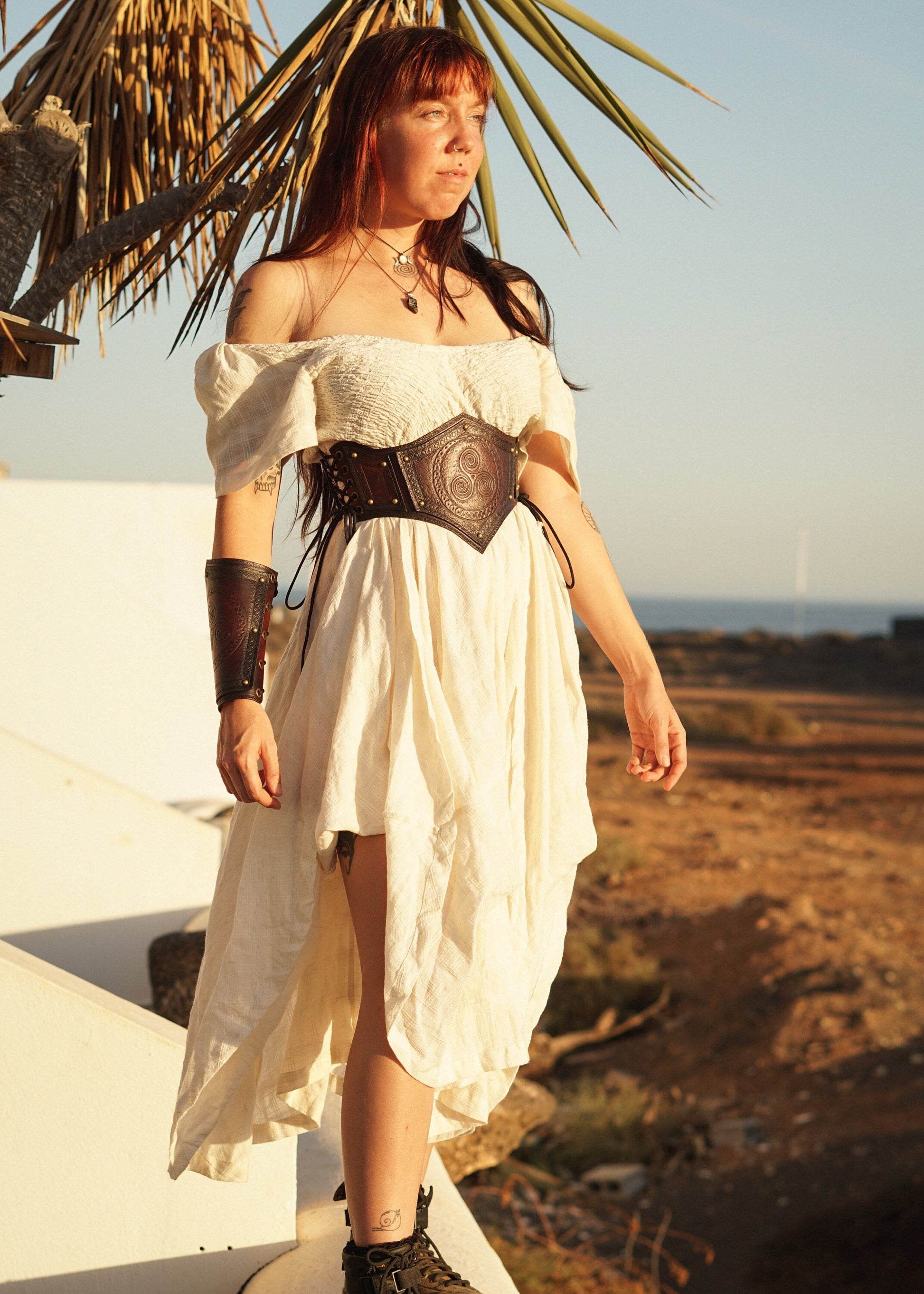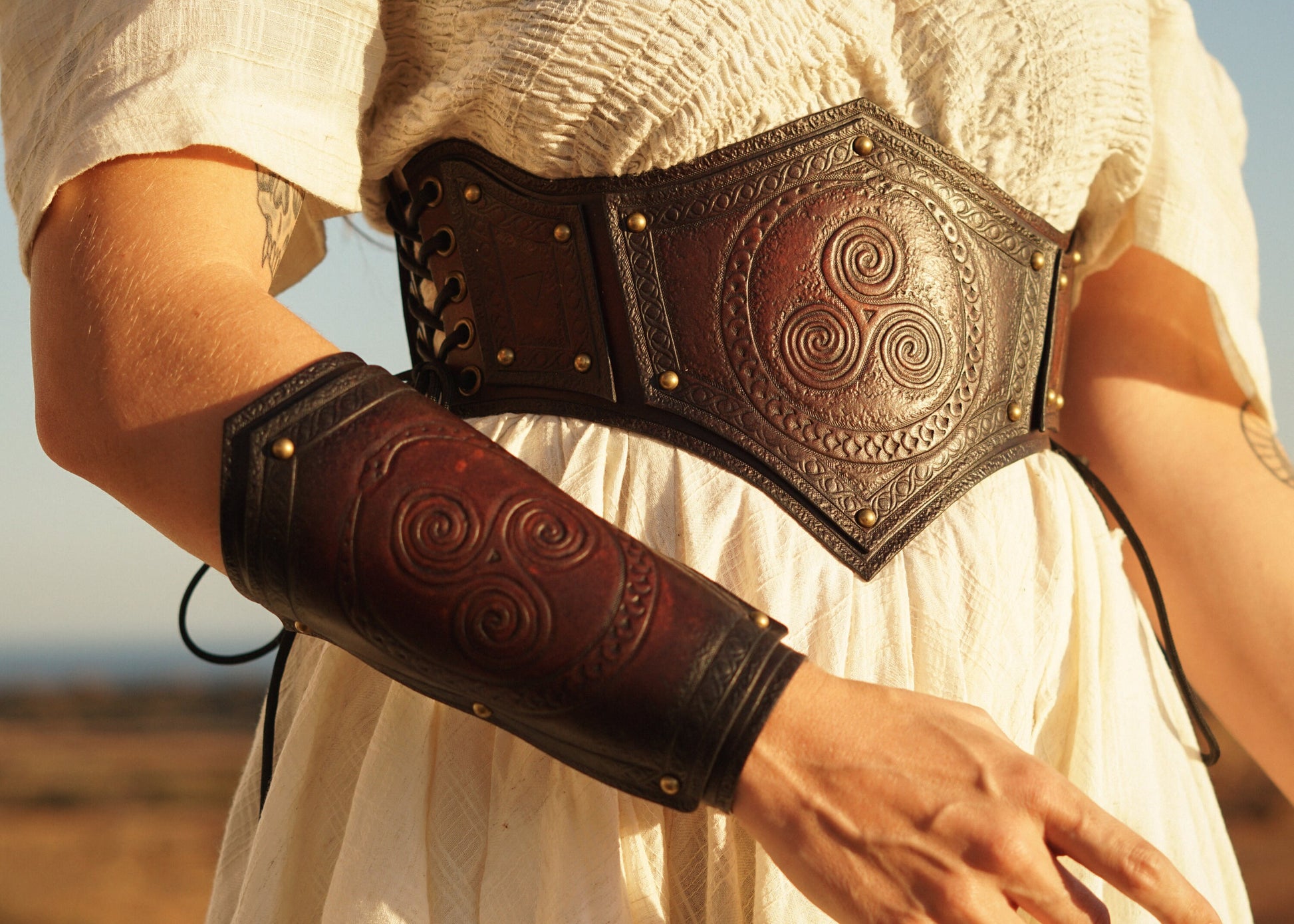 This belt features a triskele and an ouroboros. Triskele is a symbol of infinity and connection, it is found in many different cultures, possibly best know from celtic history. The ouroboro is another ancient symbol, a serpent or dragon biting it’s own tail. a symbol of infinity, rebirth and wholeness.